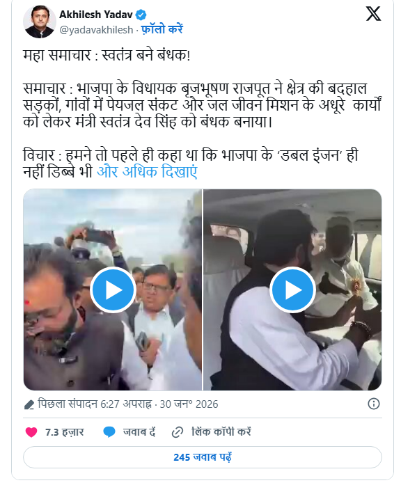 अखिलेश यादव ने पोस्ट में लिखा, “ब्रेकिंग न्यूज: मंत्री जी को बंधक बना लिया गया। खबर: भाजपा विधायक बृजभूषण राजपूत ने क्षेत्र की सड़कों की बदहाली, गांवों में पेयजल संकट और जल जीवन मिशन के अधूरे काम को लेकर मंत्री स्वतंत्र देव सिंह को बंधक बना लिया।”