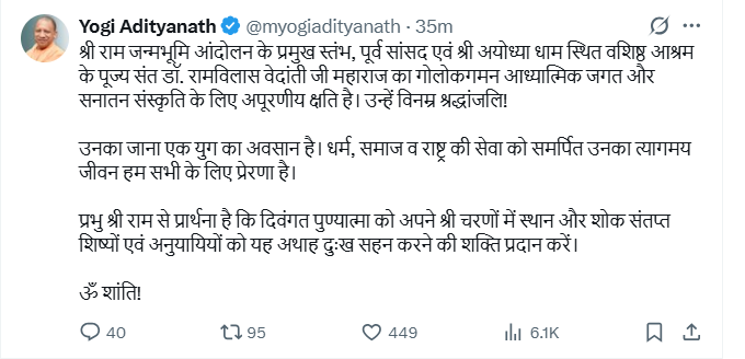 “श्रीराम जन्मभूमि आंदोलन के प्रमुख स्तंभ, पूर्व सांसद एवं श्री अयोध्या धाम स्थित वशिष्ठ आश्रम के पूज्य संत डॉ. रामविलास वेदांती जी महाराज का गोलोकगमन आध्यात्मिक जगत और सनातन संस्कृति के लिए अपूरणीय क्षति है। उनका जाना एक युग का अवसान है। धर्म, समाज और राष्ट्र की सेवा को समर्पित उनका त्यागमय जीवन हम सभी के लिए प्रेरणास्रोत रहेगा। प्रभु श्रीराम से प्रार्थना है कि दिवंगत पुण्यात्मा को अपने श्री चरणों में स्थान दें और शोक संतप्त अनुयायियों को यह दुःख सहने की शक्ति प्रदान करें।”