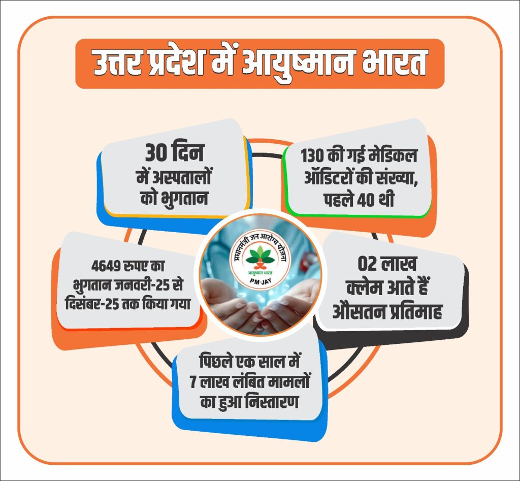 योगी सरकार गरीबों और जरूरतमंदों को बेहतर, सुलभ और समयबद्ध स्वास्थ्य सुविधाएं उपलब्ध कराने की दिशा में लगातार प्रभावी कदम उठा रही है। आयुष्मान भारत प्रधानमंत्री जन आरोग्य योजना के तहत इलाज कराने वाले परिवारों के लिए जहां कैशलेस उपचार सुनिश्चित किया गया है, वहीं योजना से जुड़े अस्पतालों को समय पर भुगतान सुनिश्चित कर व्यवस्था को और मजबूत किया जा रहा है। इसी का नतीजा है कि पिछले एक वर्ष में आयुष्मान योजना के क्लेम निस्तारण में उल्लेखनीय सुधार हुआ है।
