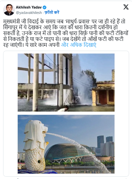 अखिलेश यादव ने लिखा:“मुख्यमंत्री जी विदाई के समय जब ‘माधुर्य-प्रवास’ पर जा ही रहे हैं तो सिंगापुर में ये देखकर आएं कि जल की धारा कितनी दर्शनीय हो सकती है।