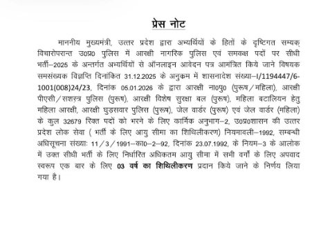 कुल 32,679 पदों की इस भर्ती के लिए 31 दिसंबर 2025 को विज्ञप्ति जारी हुई थी। अभ्यर्थियों की मांग और देरी से ओवरएज हो चुके युवाओं के हित को देखते हुए 5 जनवरी 2026 को शासनादेश जारी कर यह राहत दी गई।
